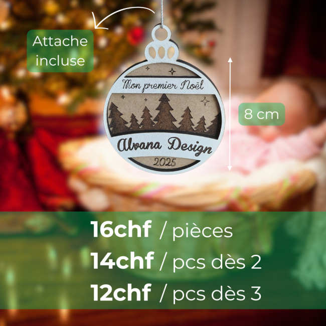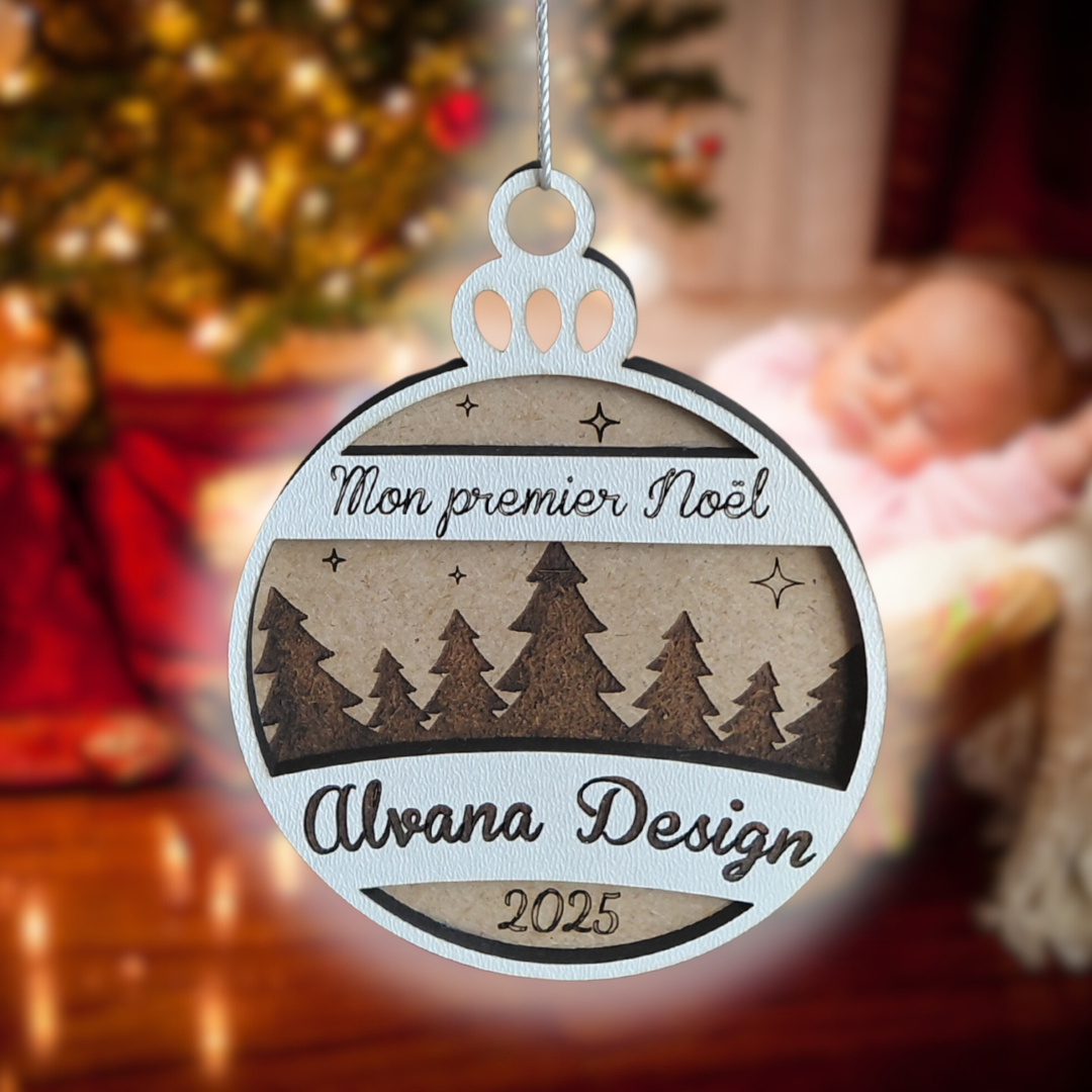 Chaque pièce est découpée au laser dans du bois MDF de qualité, puis personnalisée avec la mention “Mon premier Noël” et le prénom de votre choix.